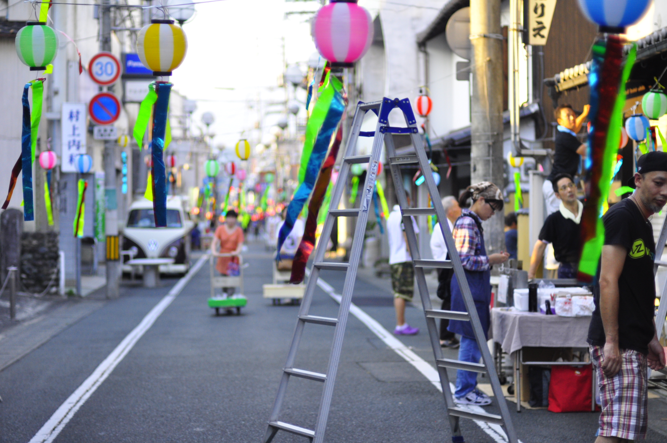 車を通行禁止にし、低めにぶら下がったちょうちんと、勝手に使ってね みたいなテーブルと椅子にビール片手に宴会の感じが、なんともイイ雰囲気。